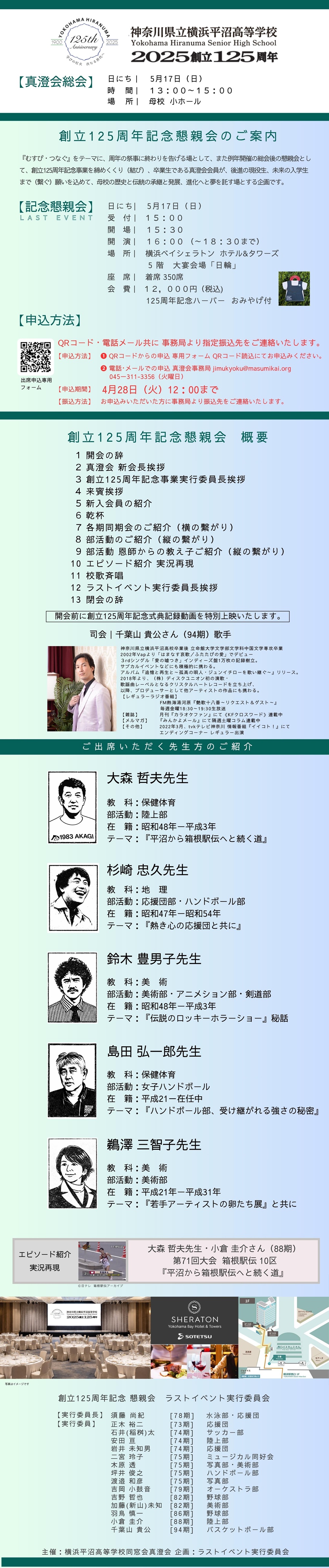 ラストイベントの企画内容等は、現在、真澄会内の実行委員会で検討しております。真澄会会員の皆様には、総会と併せて創立125周年記念懇親会「ラストイベント」へ奮ってのご参加をお願いいたします。