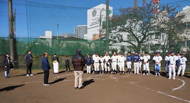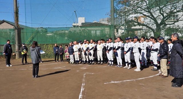 現役選手が集合すると恒例の写真撮影が行われ、続いて翠嵐会江成会長、真澄会皆藤会長から両校への激励の言葉がありました。さらに翠嵐高校の師岡校長からは「今年は文化部も含めて良い交流が行われていることを嬉しく思います」とのお言葉をいただきました。所用を終えて駆けつけてくださった平沼高校の小島校長からは「先日行われた125周年事業式典でも野球部OBが活躍し、同窓生の中で最も目立っていました。今日の活躍も期待していましたが残念でした」との挨拶がありました。