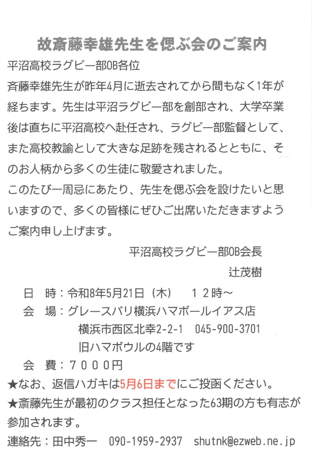 ラグビー部顧問 故斎藤幸雄先生を偲ぶ会のお知らせ