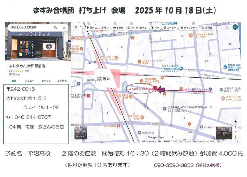 次回の練習は 10月5日(日)13:30~ 母校視聴覚室 で行います。