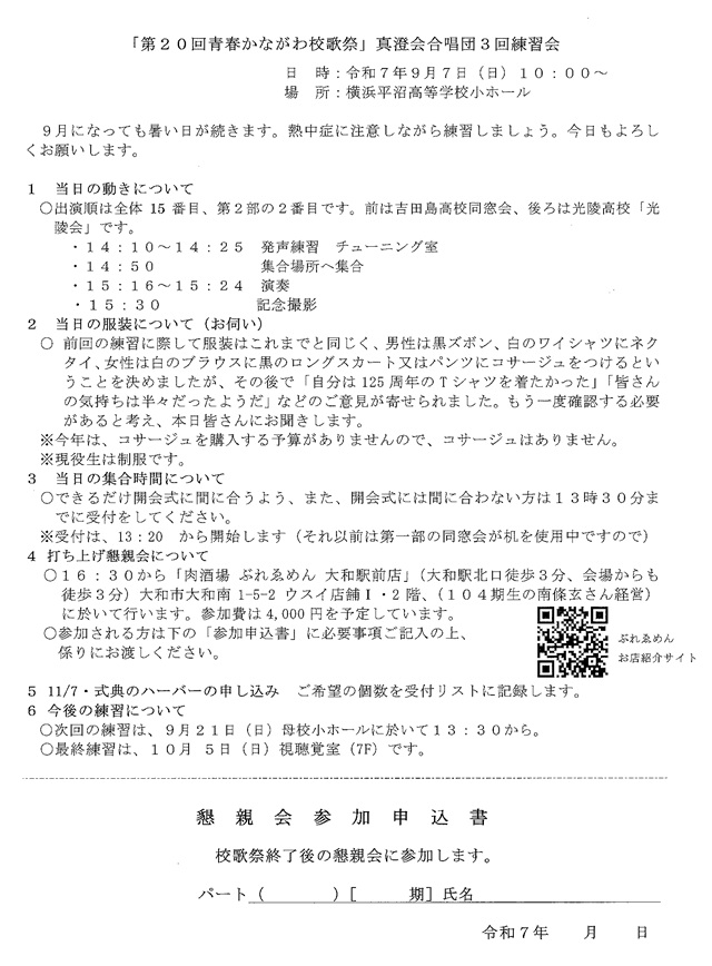 2025年9月7日(日)、母校・横浜平沼高校の小ホールにて、かながわ校歌祭に向けた第3回練習が行われました。