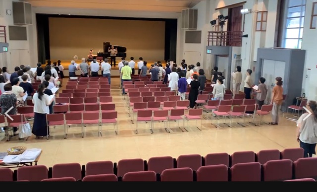 当日は厳しい暑さの中、多くの方々にご参加いただき、会場には母校の校歌と、「横浜はバラの街」の合唱練習の声が響き渡りました。どちらの曲も、本番で披露予定です。