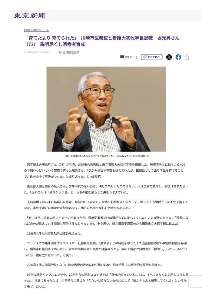 坂元さんは、川崎市の医務監や看護大学学長を歴任され、長年にわたり地域医療や人材育成に尽力されてきました。本記事では、被爆者の父を持つご自身の生い立ちや、そこから医師の道を志した経緯、そして現場での経験を通して「人に伝え、育てること」の大切さに向き合ってこられた歩みが紹介されています。 これまでのご経験とともに、次の世代へ思いをつないでいく姿勢が印象的な内容となっております。ぜひご覧ください。