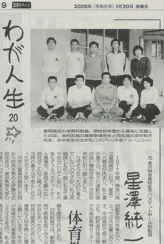 神奈川新聞2026年1月30日付「わが人生」に、元金沢総合高校女子バスケットボール部監督・星澤純一さんの記事が掲載されました。