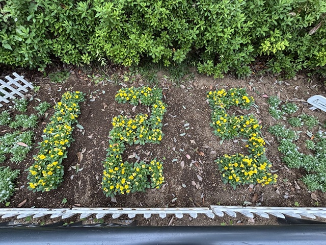 正門横の花壇に、鮮やかな黄色のパンジーで形づくられた「125」の文字が並んでいます。
